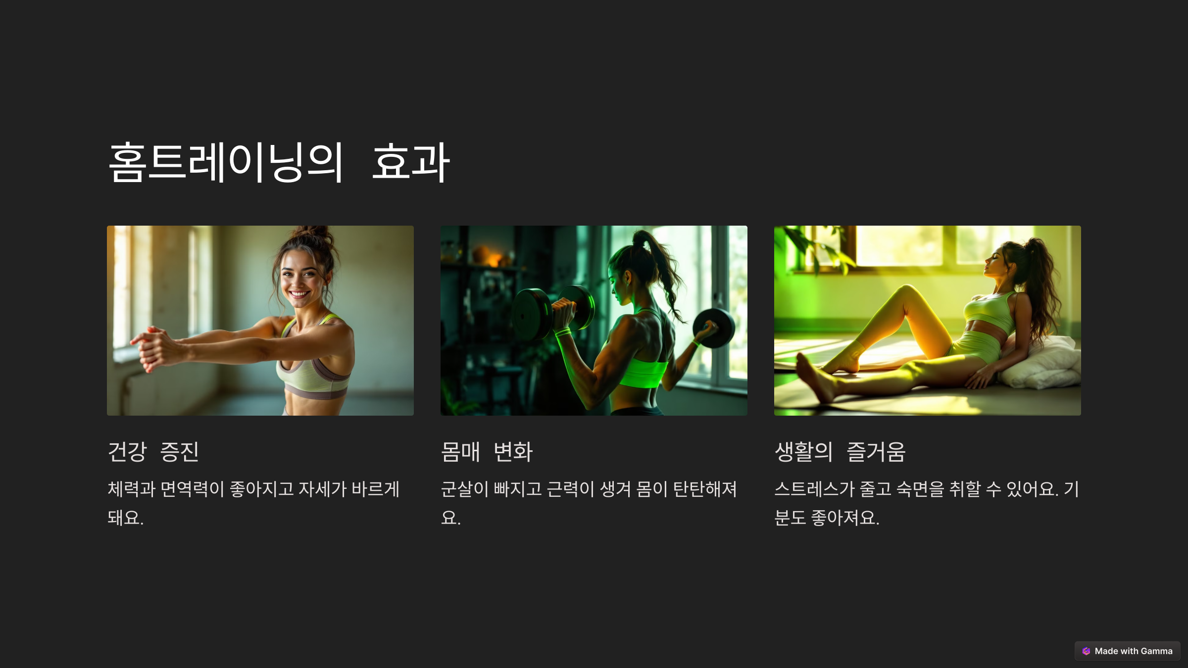 홈트레이닝은 누구나 할 수 있어요! 처음에는 힘들 수 있지만, 한 달만 꾸준히 해보세요. 분명 달라진 모습을 발견할 수 있을 거예요. 지금 당장 시작해보는 건 어떨까요?