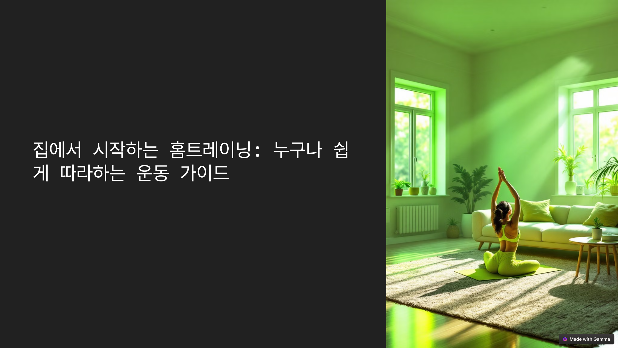 안녕하세요! 오늘은 집에서 할 수 있는 홈트레이닝에 대해 알아볼게요. 운동은 어렵지 않아요. 지금부터 제가 쉽게 설명해드릴게요! 😊