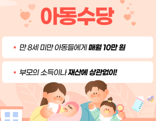 아동수당 - 만 8세까지 10만 원 월 지급